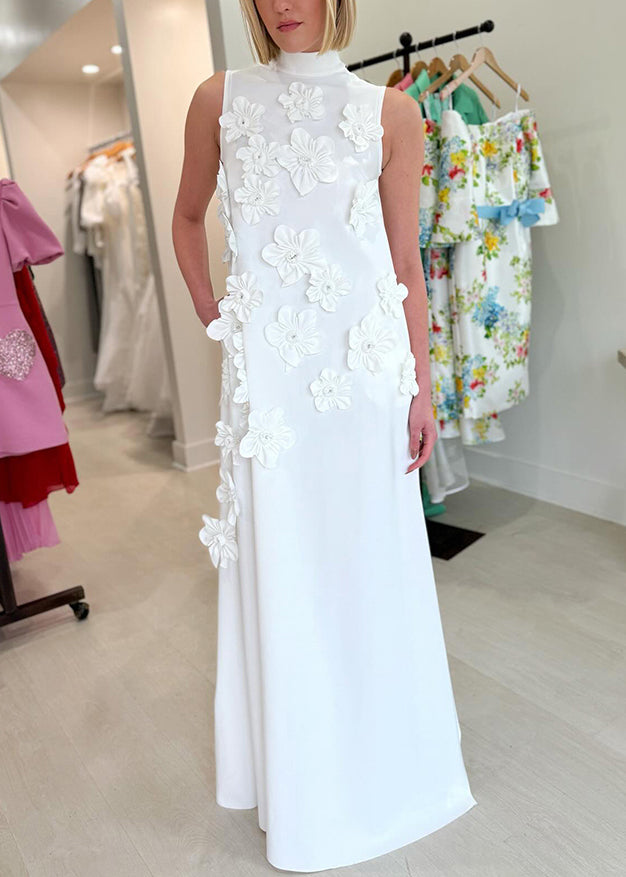Lace Pink Cotton Up Long Dress Floral Sleeveless Pockets Elegant