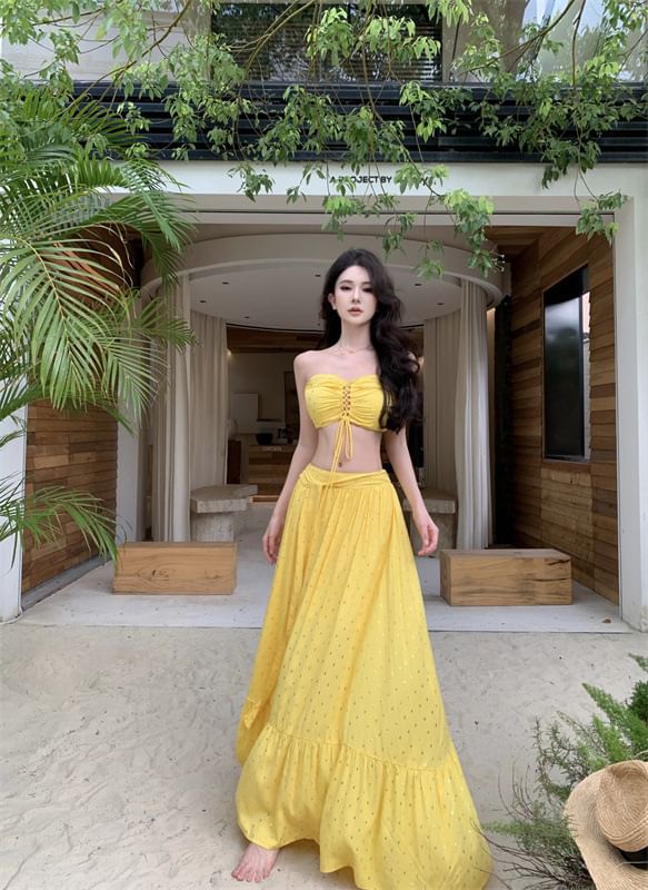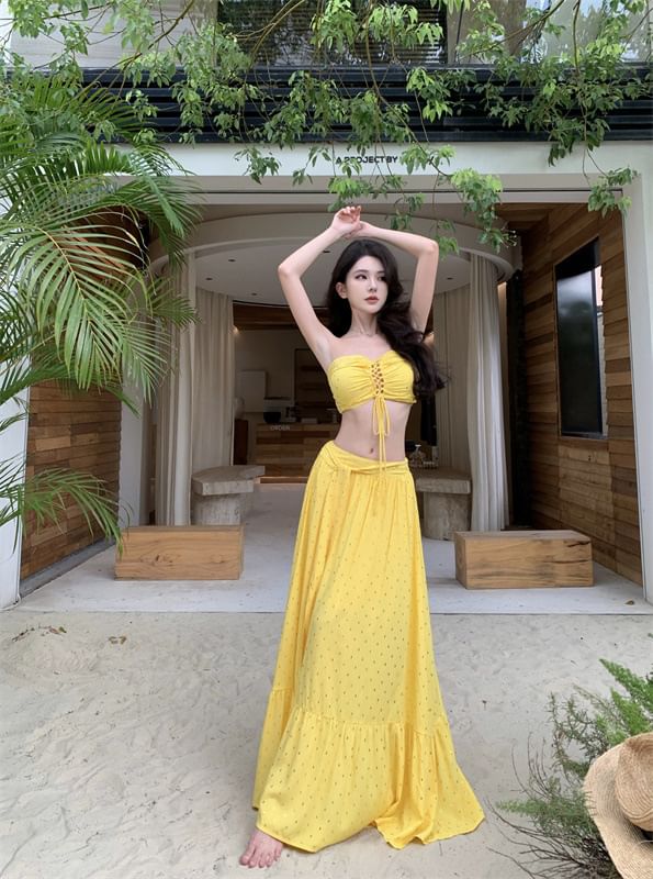 Set: Lace-Up Crop Tube Top + Mid Rise Maxi A-Line Skirt
