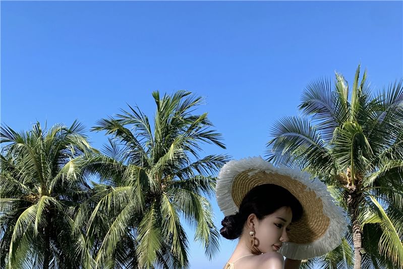 Spaghetti Strap Plain Ruffle Cutout Slit Maxi A-Line Dress