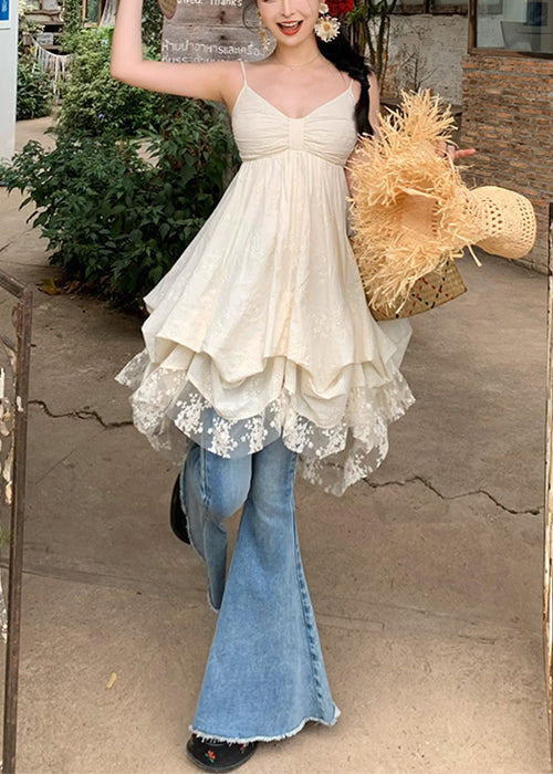 Elegant Beige V Neck Lace Cotton Mini Dresses Sleeveless