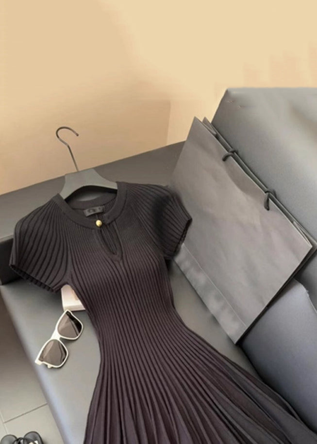 Neck Summer Solid Black O Mid Dress Wrinkled Knit Women
