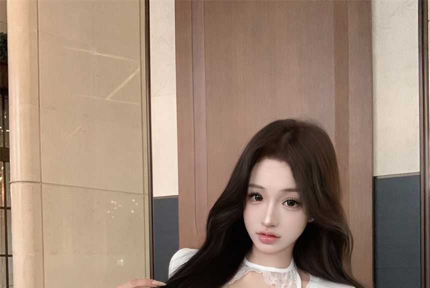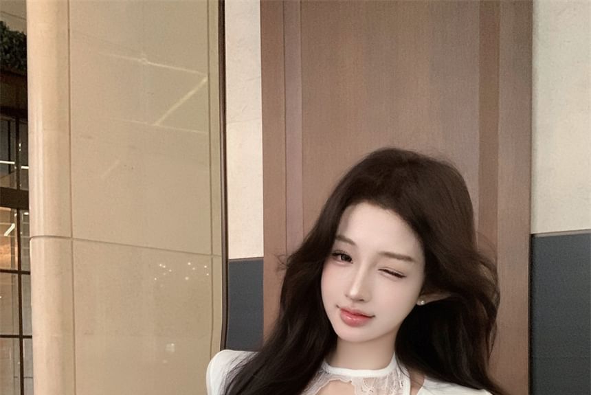 Long Sleeve Round Henley Neck Plain Lace Panel T-Shirt