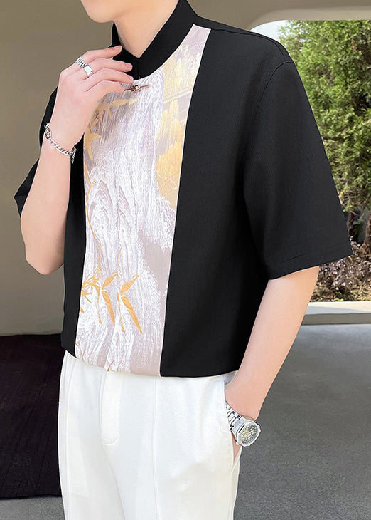 Shirt Patchwork Beige Collar Chic Half Men Stand Sleeve T