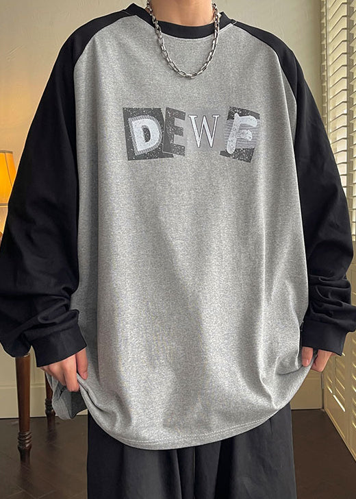 Loose Grey O Neck Print Patchwork Cotton Men T Shirt Spring
