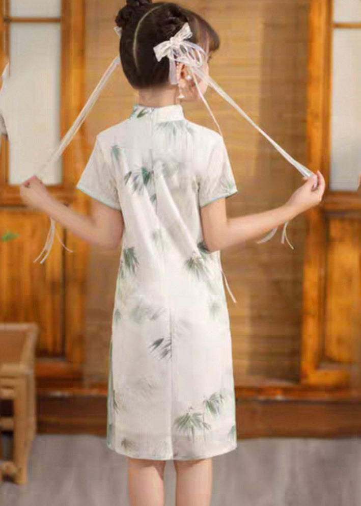 Vintage White Print Side Open Girls Long Dress Short Sleeve