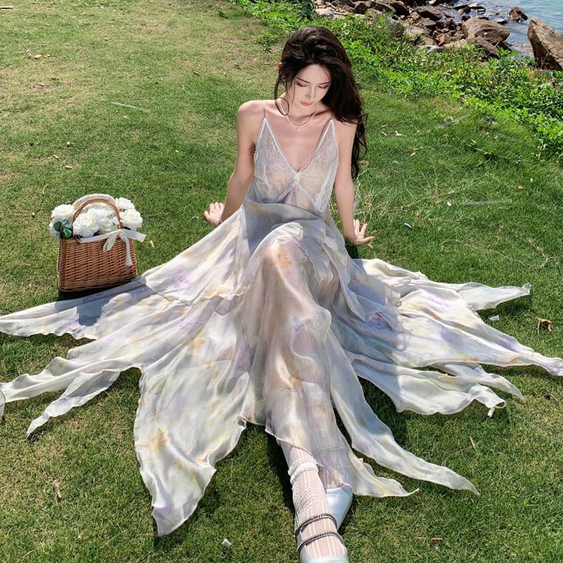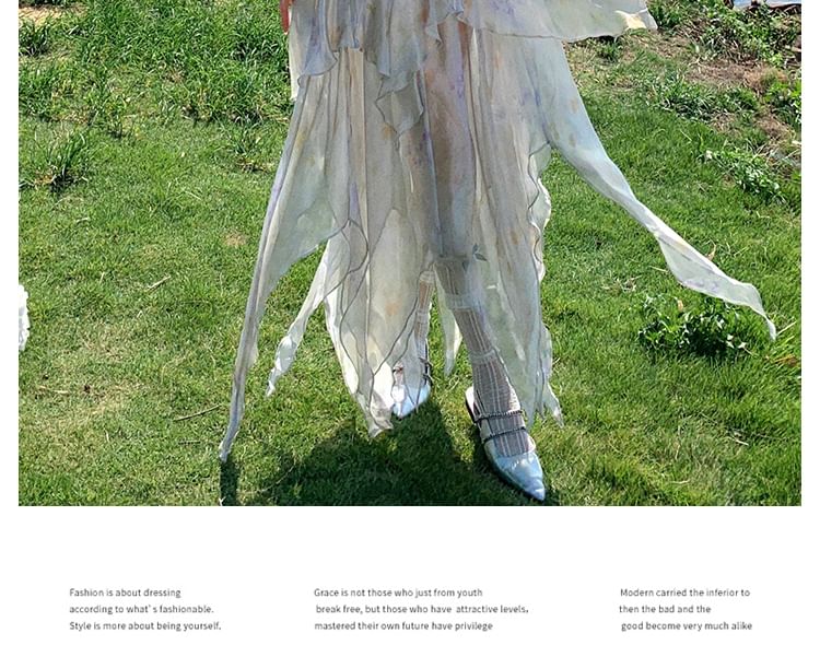 Sundress Panel A-Line Spaghetti Asymmetrical Midi Strap Floral Lace