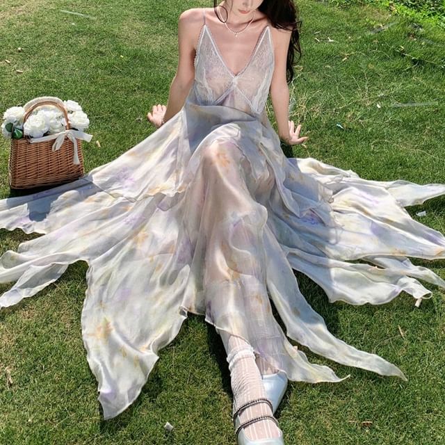 Spaghetti Strap Floral Asymmetrical Lace Panel Midi A-Line Sundress