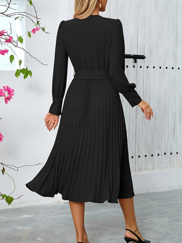 Dresses Type: Plain Dress, Casual Dress, A Line Dress, Fabric: Polyester, Gender: Women's, Design: Belted, Occasion: Street, Sports & Outdoor, Style: Casual, Fit Type: Regular Fit, Dress Length Type: Midi Dress, Neckline: V Neck, Elasticity: Micro-elastic, Look After Me: Wash separately, Machine wash, Season: Fall, Spring,
