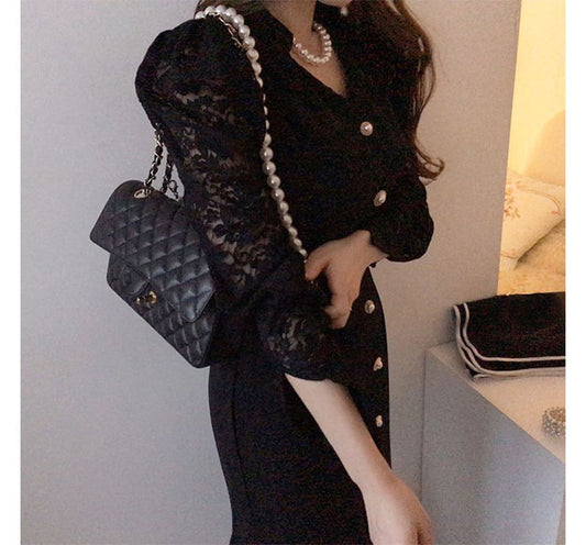 Flared-Cuff V-Neck Lace Panel Midi Mermaid Dress
