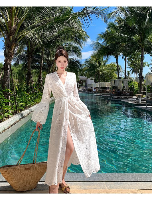 Flare Shirt Sleeve O Out French Cotton Hollow White Neck