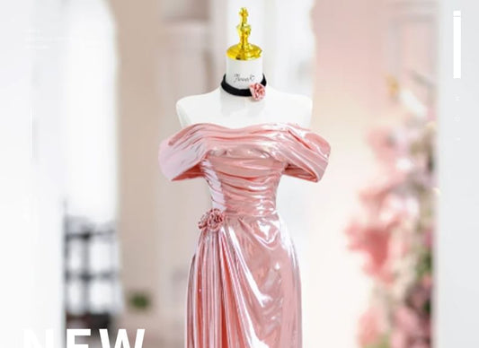 Short-Sleeve Off Shoulder Plain Pleated Satin A-Line Evening Gown