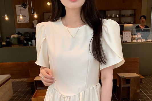 Short-Sleeve Round Neck Plain Midi A-Line Dress