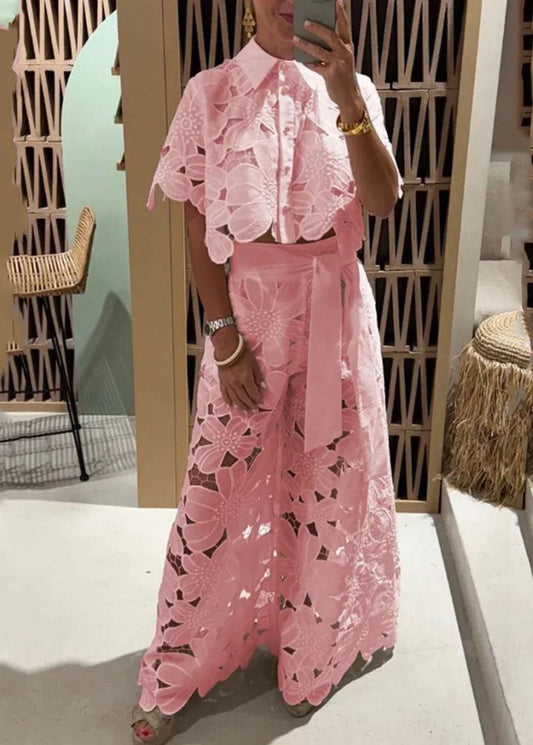 Two Chic Leg Hollow Shirts Out Set White Wide Pieces Pants And