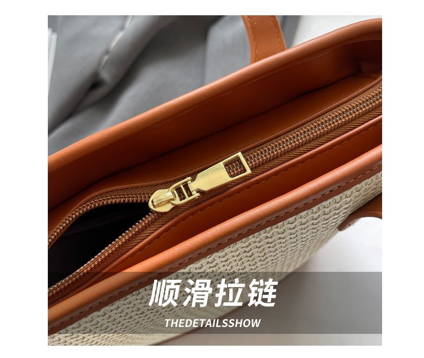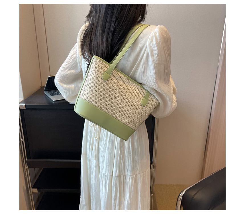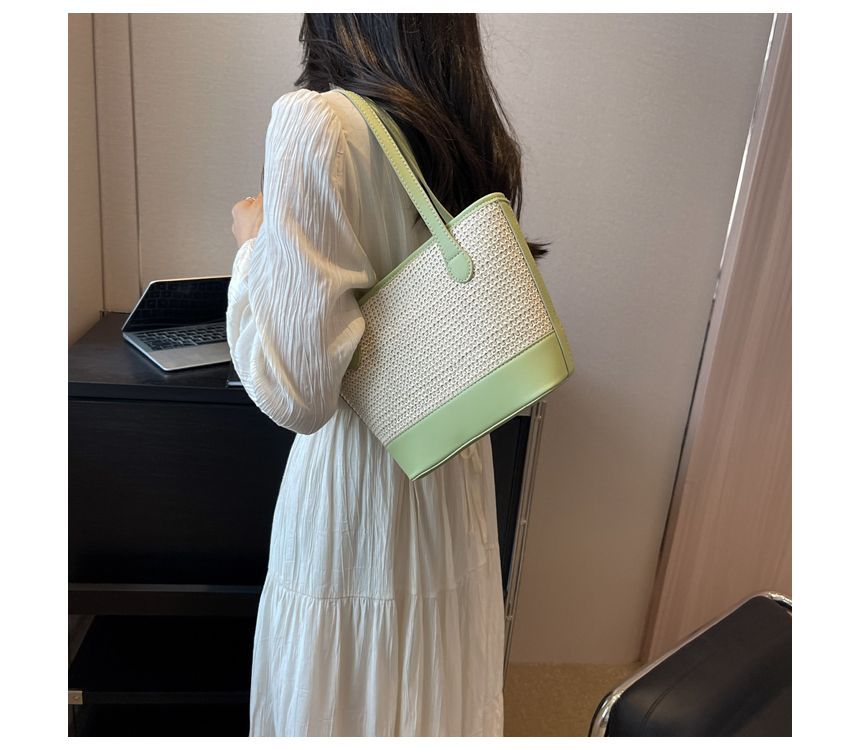 Faux Leather Panel Woven Bucket Bag