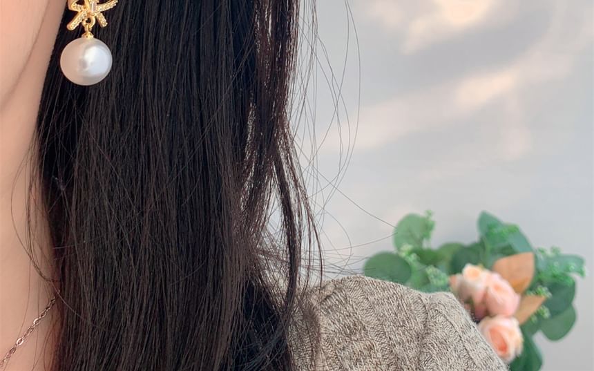 Faux Pearl Rhinestone Huggie Drop Bow Earring