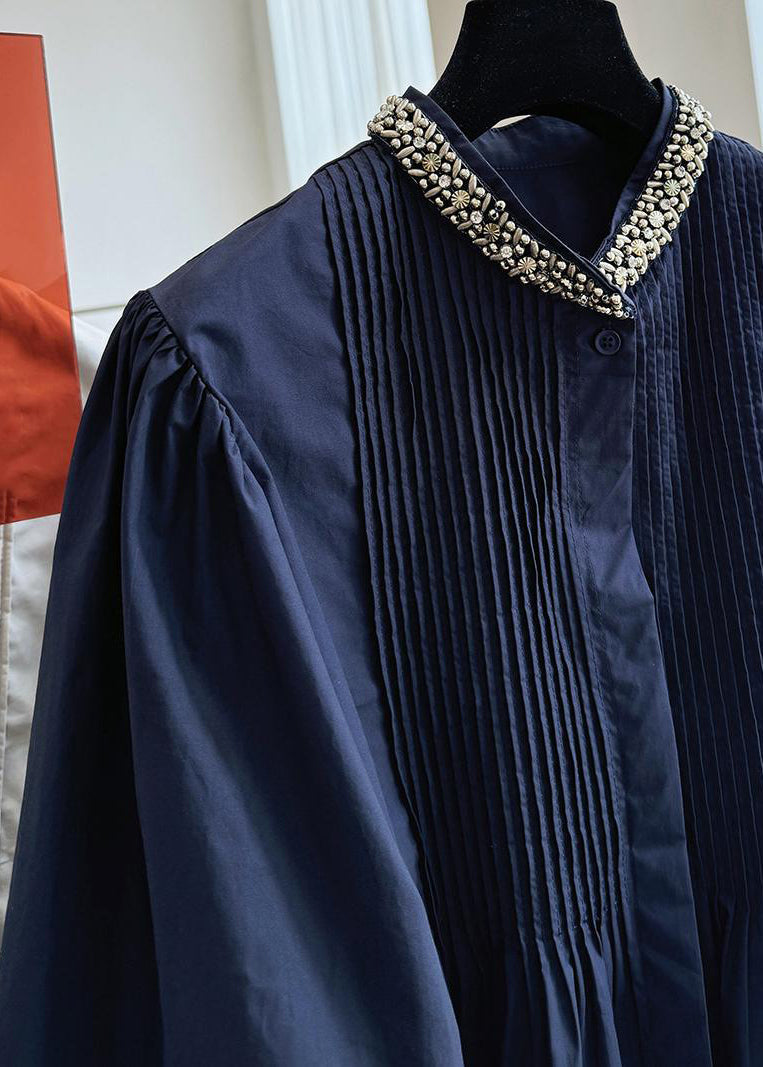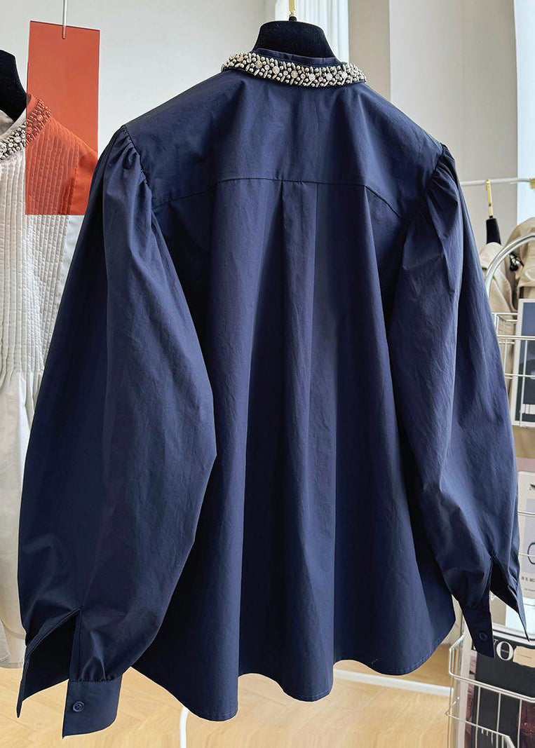 Elevate your style with our luxurious French Navy Stand Collar Nail Bead Cotton Shirts Top, the perfect addition to your fall wardrobe.