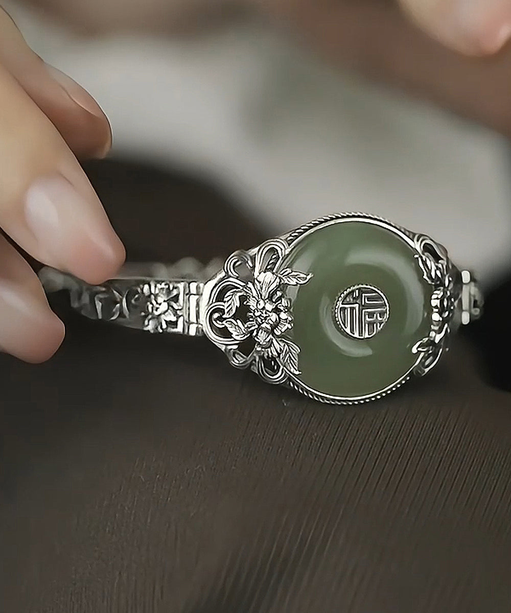 Retro Silk Sterling Silver Jade Peony Ping Buckle Bangle RB026