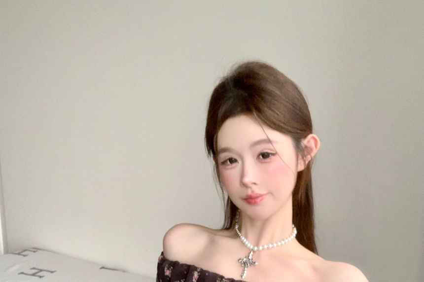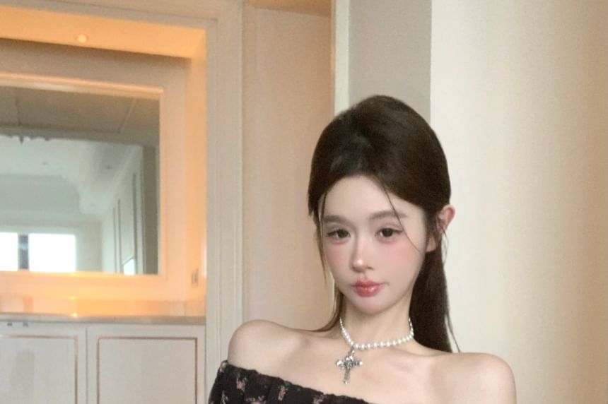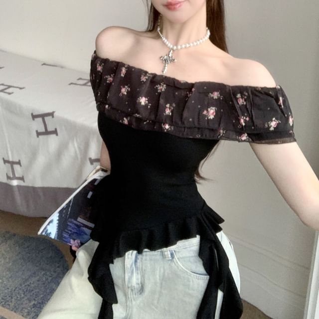 Cap-Sleeve Off-Shoulder Floral Panel Ruffle Trim Slim Fit Tee