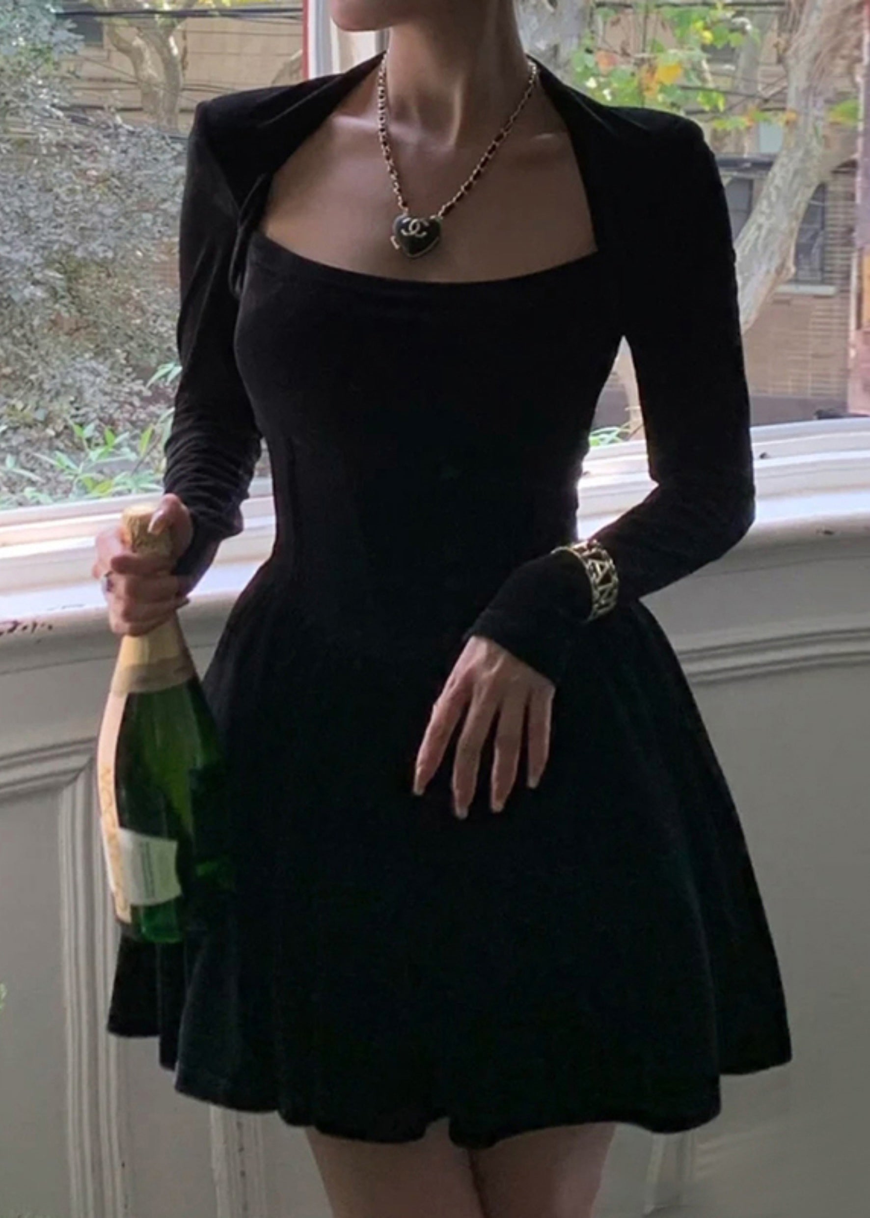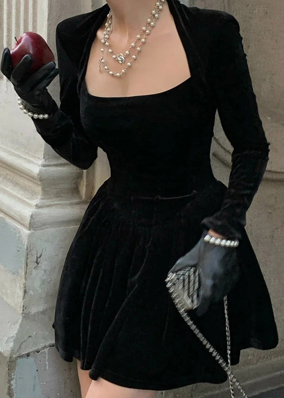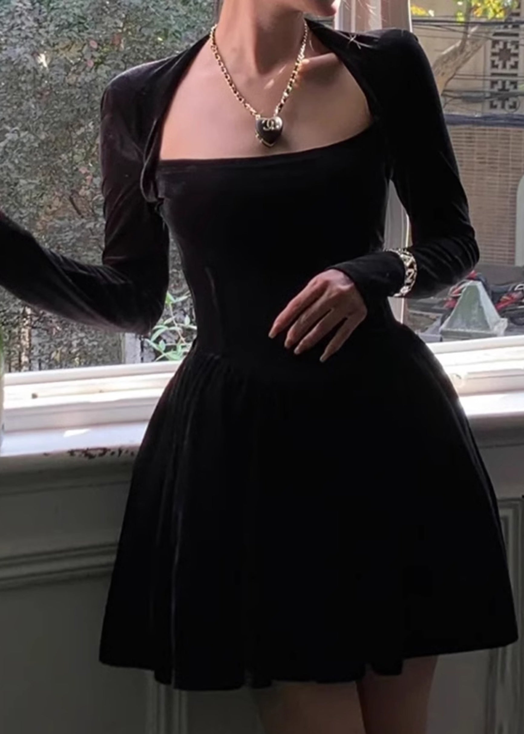 Women Red Square Collar Solid Silk Velvet Mid Dress Spring YT023