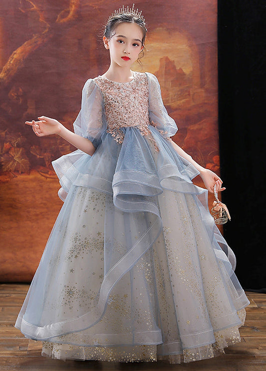 Fashion Blue O-Neck Sequins Patchwork Tulle Kids Maxi Dress Puff Sleeve QV023
