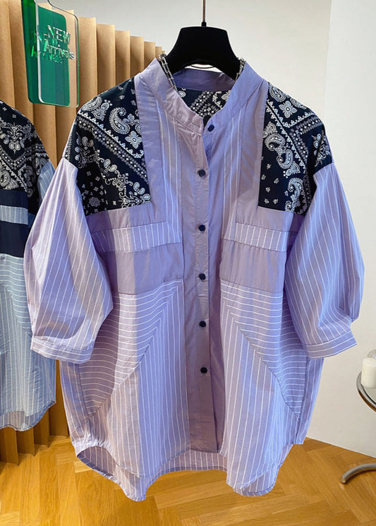 Fashion Blue Stand Collar Print Patchwork Shirt Fall UU039
