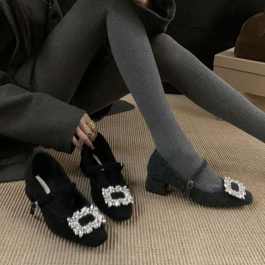 Heel Jane Square Buckled Toe Block Rhinestone Mary Pumps