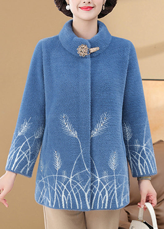 omen Blue Print Pockets Mink Velvet Coats Spring TA035