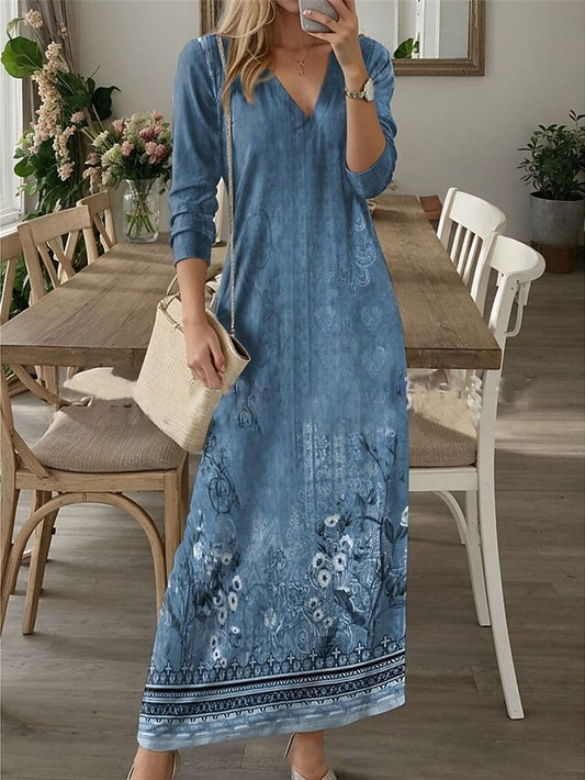 Women's Floral Print V Neck Long Dress Maxi Dress 3/4