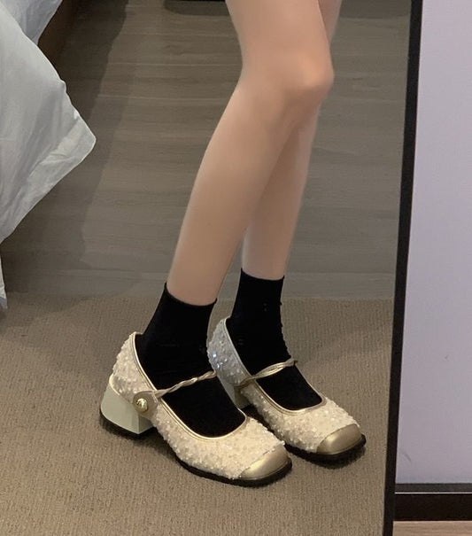 Sequin Cap Toe Chunky Heel Mary Jane Pumps