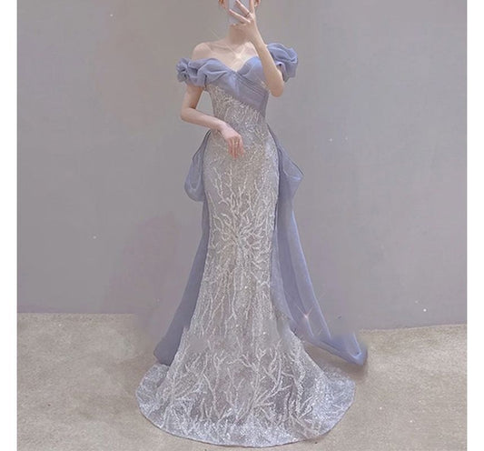 Puff Sleeve Scoop Neck Faux Pearl Beaded Mesh Panel Satin A-Line Evening Gown