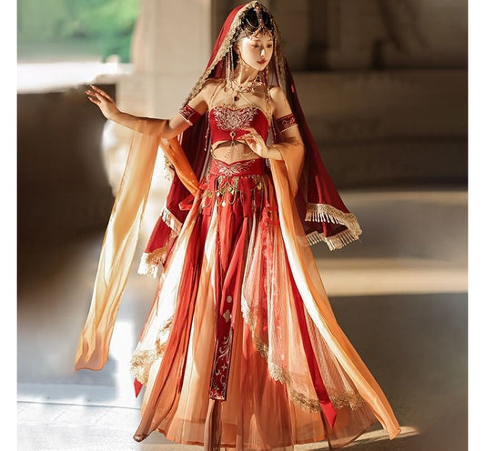 Set: Lolita Strapless Embroidered Crop Top + High Rise Midi A-Line Skirt + Arm Let + Scarf + Veil