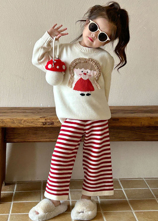 Lovely Beige O-Neck Character Kids Cotton Knit Sweaters And Flare Trousers Two Pieces Set Spring TR032