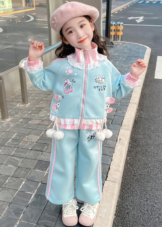 Stylish Blue Ruffled Patchwork Kids Coats And Straight Pants Two Pieces Set Spring TR027
