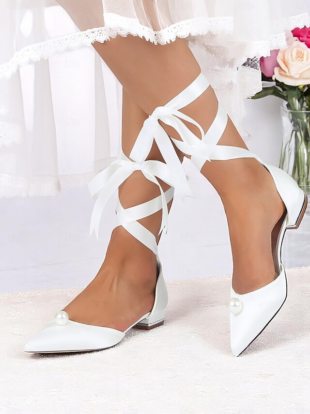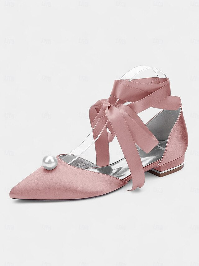 Gender: Women's, Category: Flats, Style: Elegant, Fashion, Occasion: Party, Wedding, Activity: Walking, Toe Shape: Pointed Toe, Upper Materials: Satin, Lining Materials: Synthetic Leather, Outsole Materials: Rubber, Platform Height (inch): 0.39, Embellishment: Imitation Pearl, Season: Winter, Fall, Summer, Spring, Size Suggestion: standard size, select your usual size, Closure Type: Lace-up, Heel Height(inch): 0.98, Heel Type: Flat Heel,