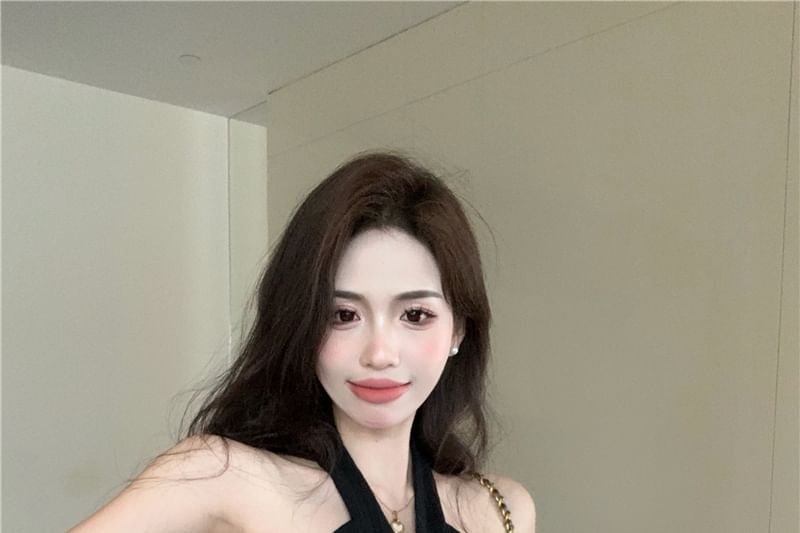 Feather Maxi Halter A-Line Waist High / Skirt Crop Pleated Trim Plain Top