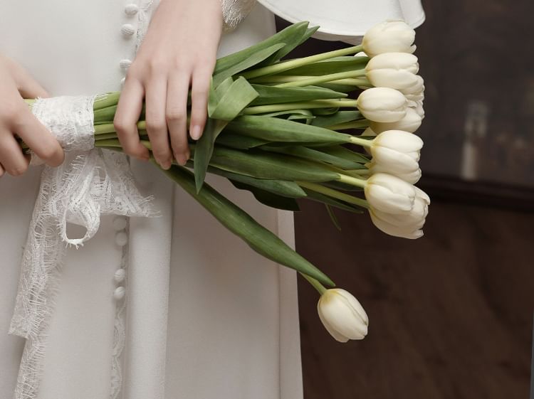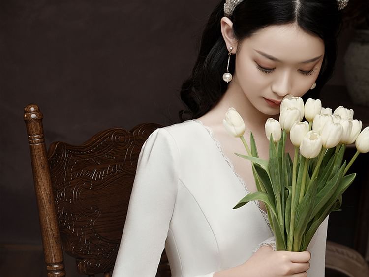 Flared-Sleeve V-Neck Plain Open Back Lace Trim Trumpet Wedding Gown
