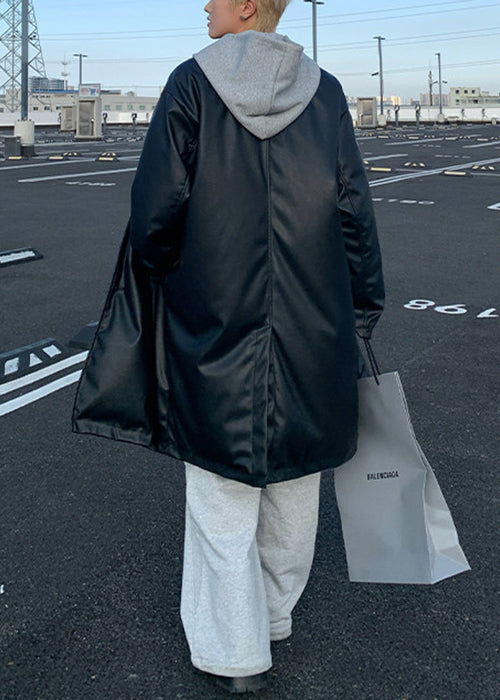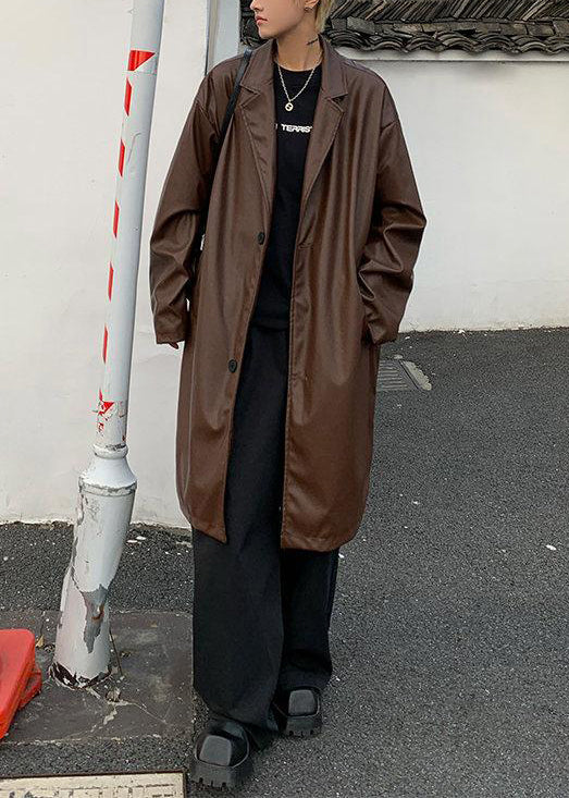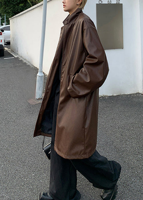 Indulge in the luxurious simplicity of our Brown Faux Leather Men's Coats, adorned with a stylish Peter Pan collar and classic button detail. Perfect for the spring season, this premium piece exudes sophistication and exclusivity.