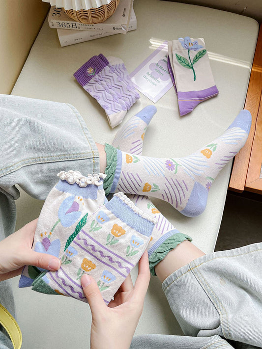 5 Pairs Women Artsy Flower Cotton Socks IO1012