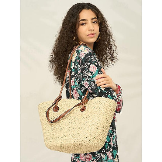 Straw Large Women's Leather Tote Straps Chic Boho with Bag