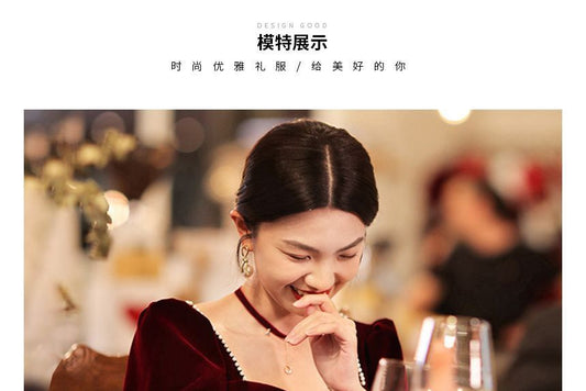 Short-Sleeve Sweetheart Neck Flower Embroidered Faux Pearl Velvet Maxi A-Line Cocktail Dress