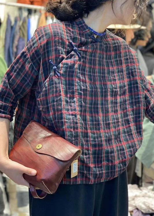 Vintage Plaid Button Cotton Blouses Stand Collar Bracelet Sleeve YH018