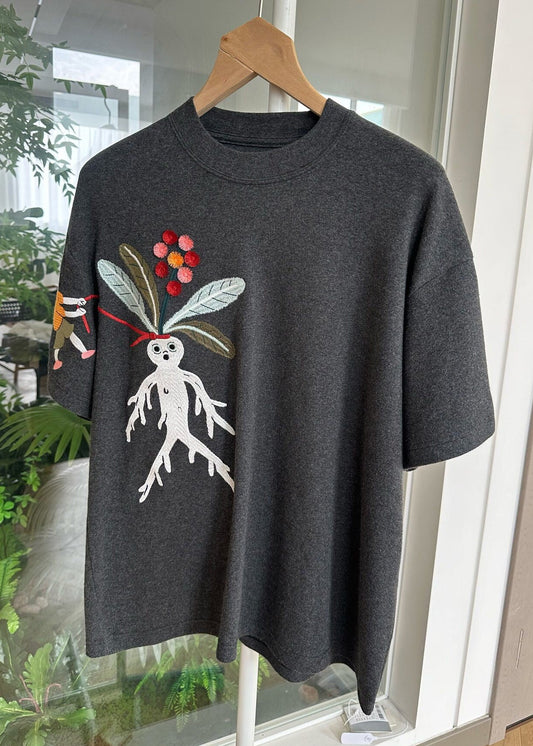 Loose Grey O-Neck Embroidered Cotton T Shirt Summer YH022