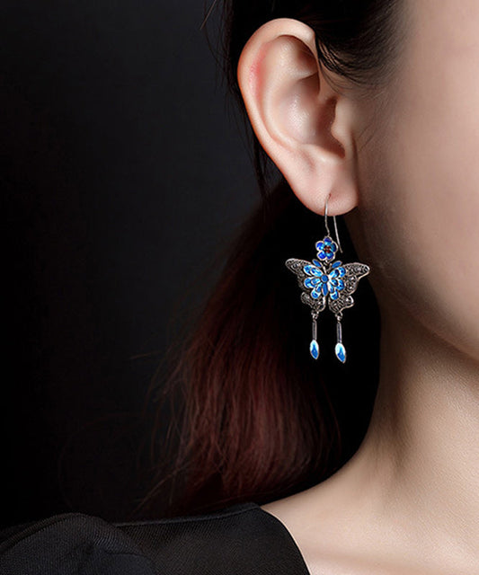 Vintage Boutique Blue Sterling Silver Butterfly Plum Blossom Tassel Drop Earrings QJ026