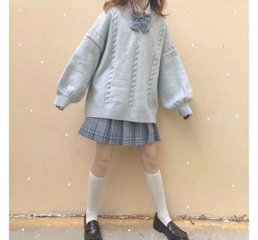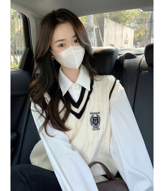 Collared Plain Shirt / V-Neck Sweater Vest / High Rise Plain Mini Pleated Skirt