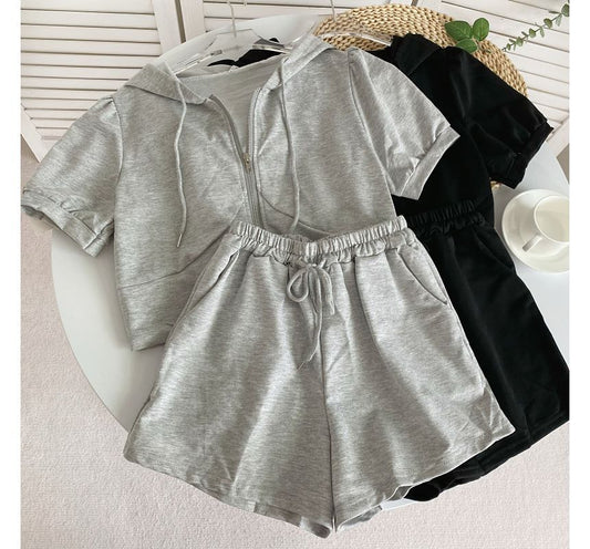 Set: Short-Sleeve Zip-Up Crop Hoodie + Shorts