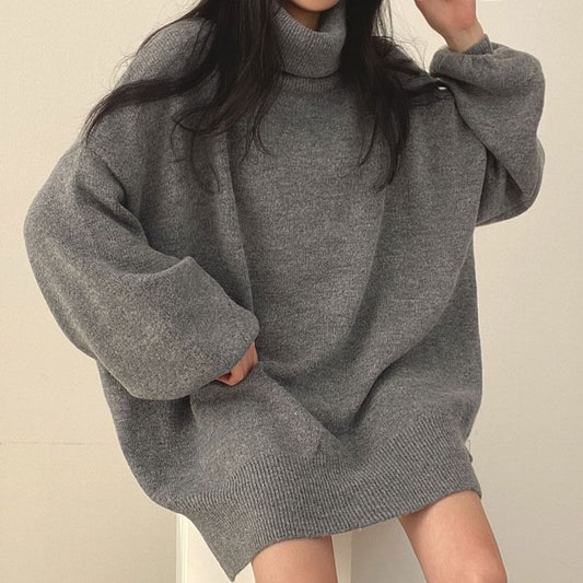 Balloon Sleeve Turtleneck Plain Slit Oversized Sweater