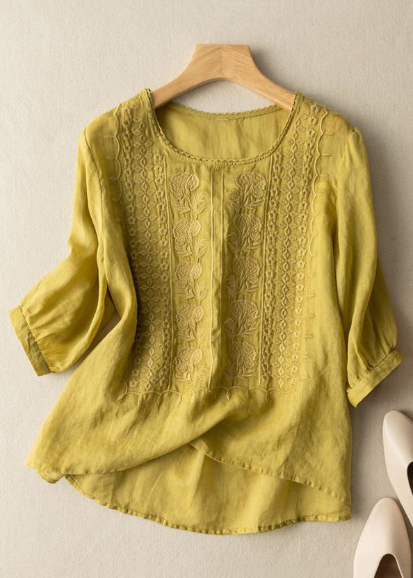 Art Blue O Neck Embroidered Linen T Shirts Half Sleeve YH007