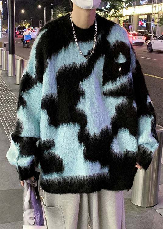 Chic Blue O Neck Patchwork Knit Mens Sweater Winter RC030