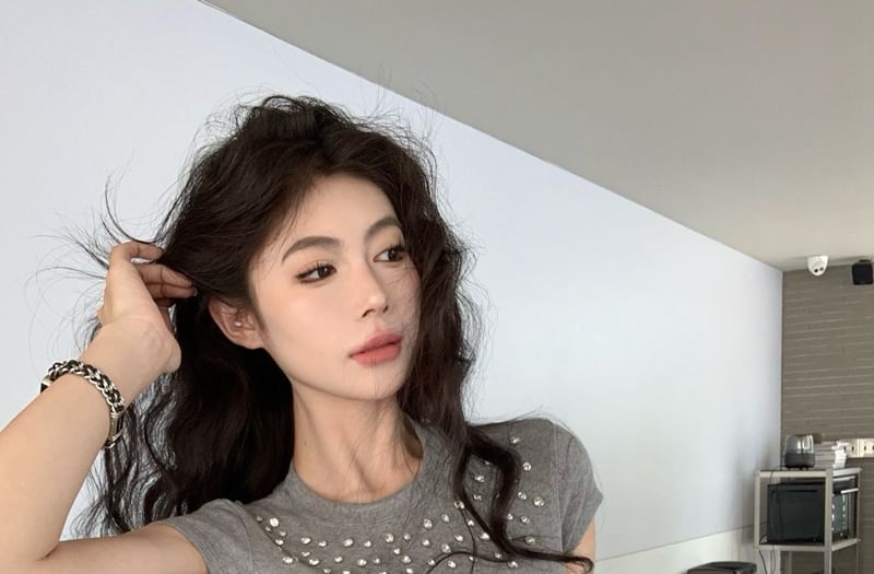 Crewneck Tee Crop Short-Sleeve Rhinestone
