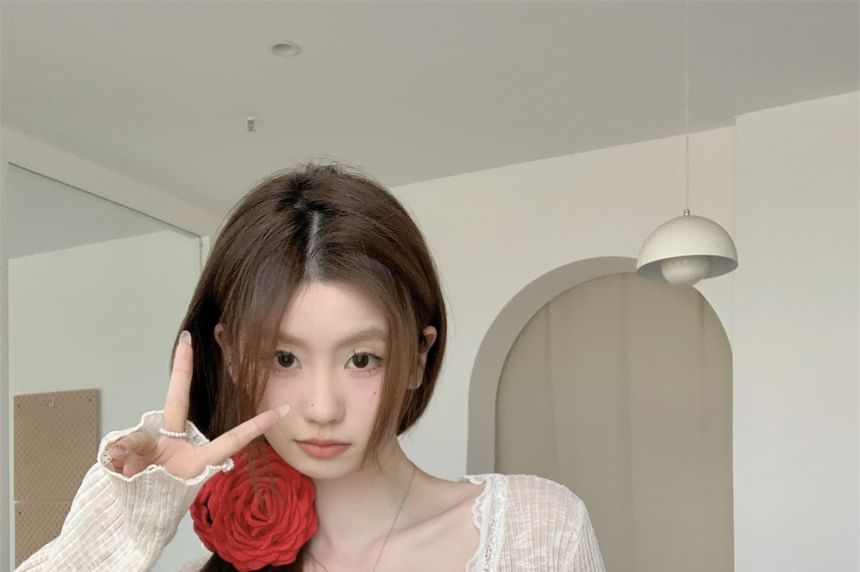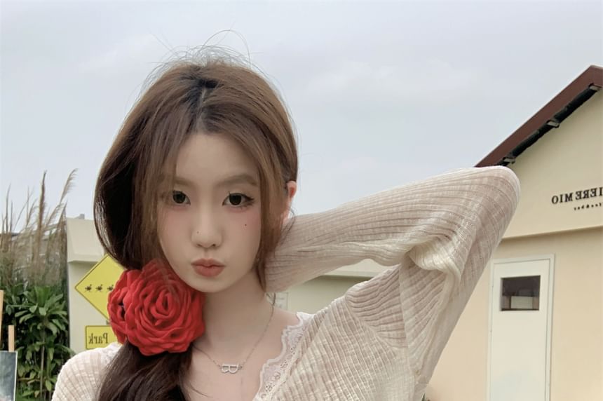 V-Neck Lace Trim One-Buttoned Plain Sheer Crop Cardigan